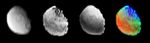 The Cassini visual and infrared mapping spectrometer analyzed the surface composition of Saturn's moon Iapetus as Cassini flew over the polar region on Dec. 31, 2004. The image at left shows the reflectance at 4-microns, which is dominated by the minerals on Iapetus' surface. Two large craters are seen in this image. The polar water ice is relatively dark at this wavelength, so the ice cap is not seen. The next frame shows carbon dioxide on the surface. The carbon dioxide peaks at mid latitudes and shows less strength at the pole and along the equator (the dark band curving near the left edge of the image). The third frame shows the strength of water absorption on Iapetus. The brightest regions are due to water ice near the pole. The grayer areas indicate water bound to minerals on the surface. The color composite shows water as blue, carbon dioxide as green, and non-ice minerals as red.
