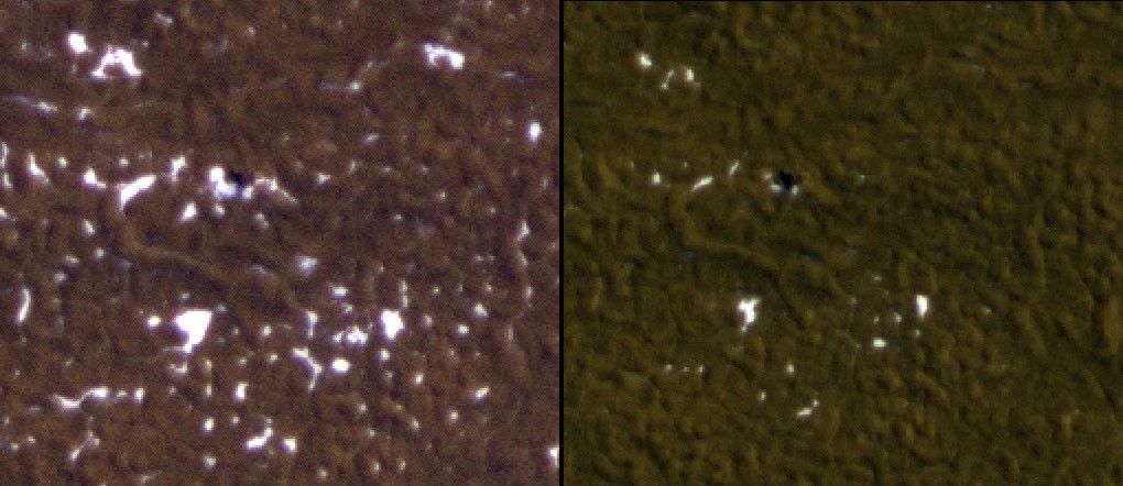 Stages in the seasonal disappearance of surface ice from the ground around the Phoenix Mars Lander are visible in these images taken on Feb. 8, 2010, (left) and Feb. 25, 2010, during springtime on northern Mars.