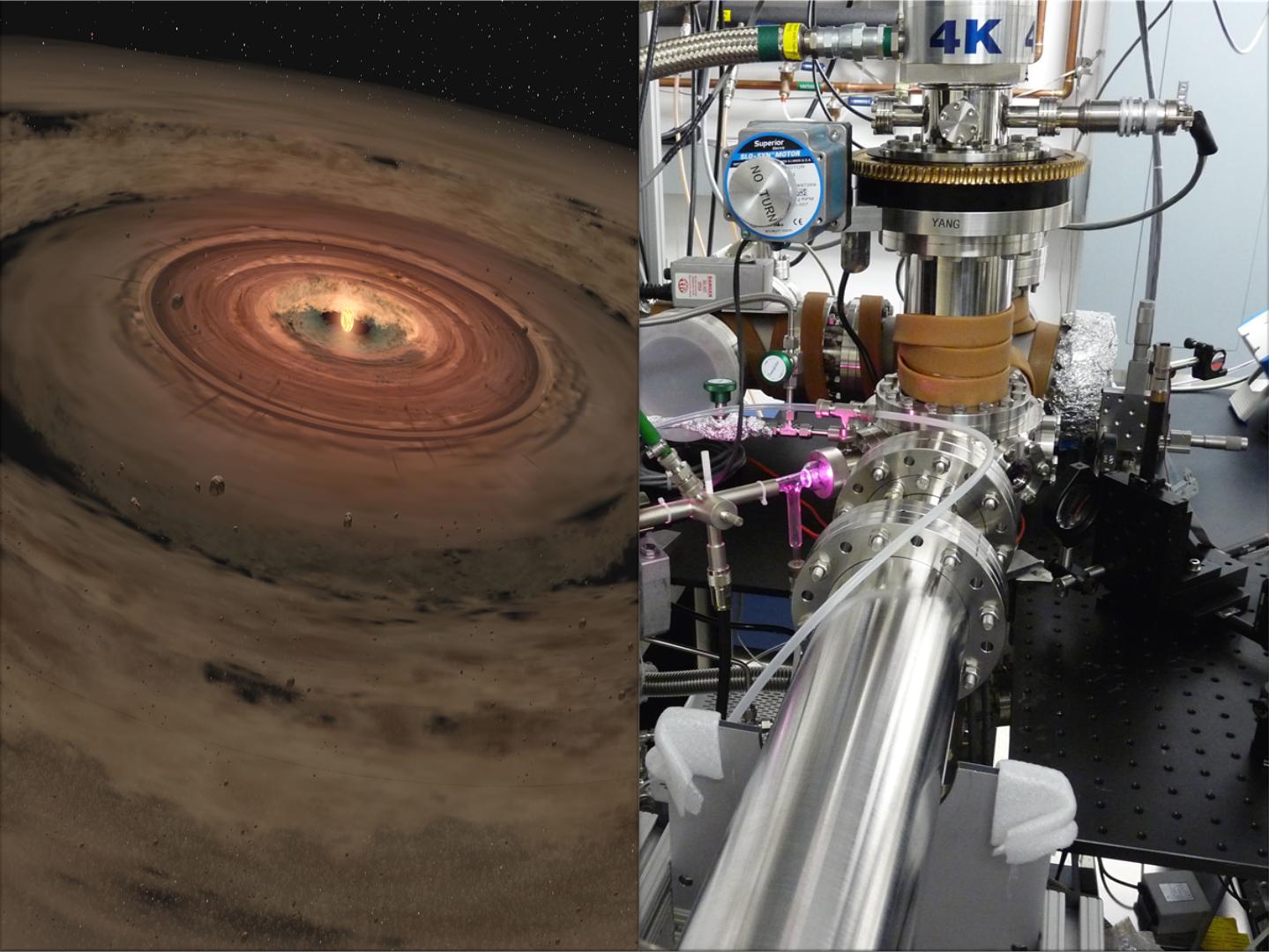 Researchers are brewing up icy, organic concoctions in the lab to mimic materials at the edge of our solar system and beyond. The laboratory equipment at NASA's Jet Propulsion Laboratory in Pasadena, Calif., is seen at right, and a very young solar system, with its swirling planet-forming disk, is shown in the artist's concept at left.