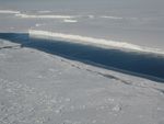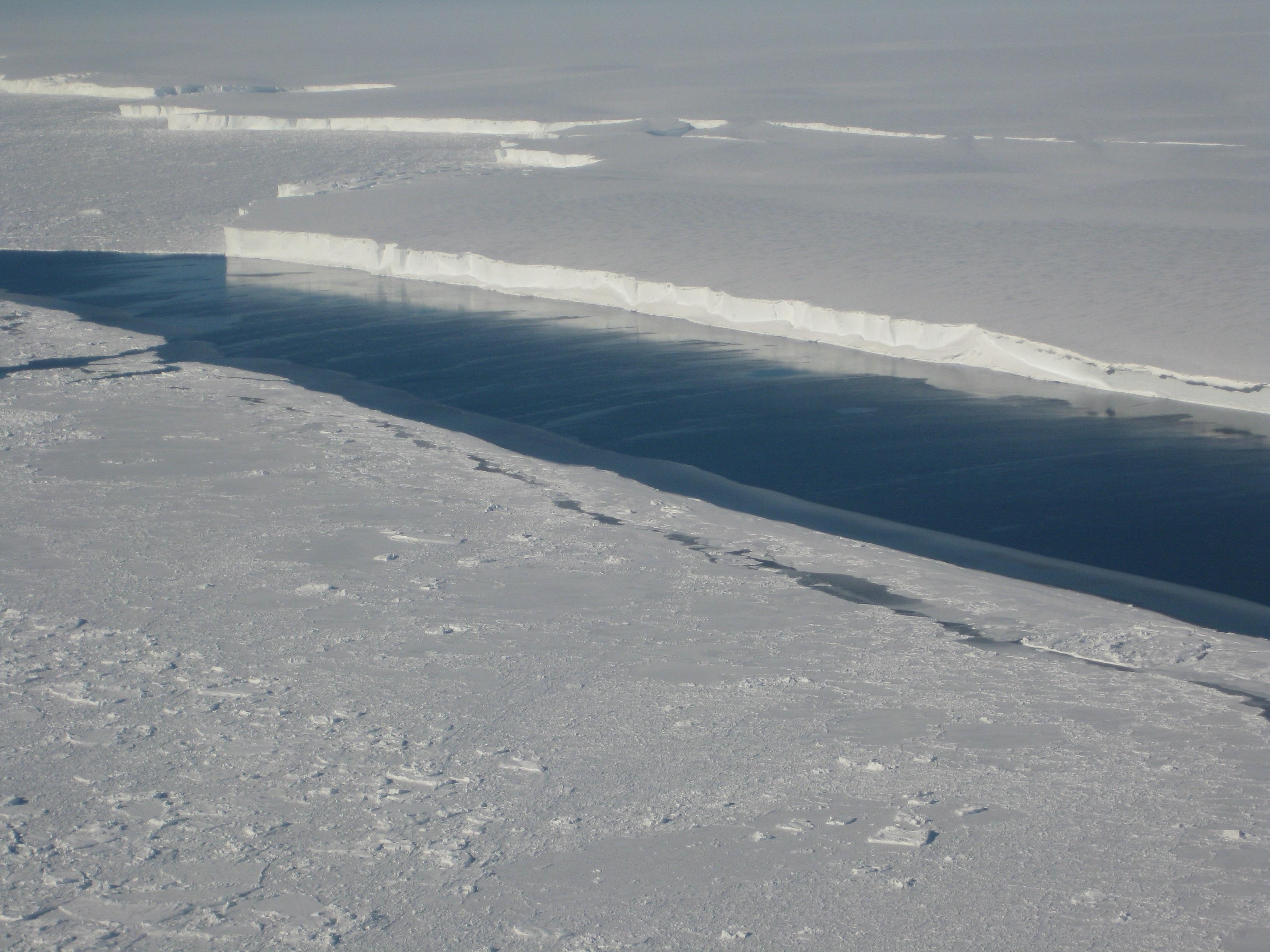 This photo, taken onboard the Chilean Navy P3 aircraft, shows the ice front of Venable Ice Shelf, West Antarctica, in October 2008. It is an example of a small-size ice shelf that is a large melt water producer.