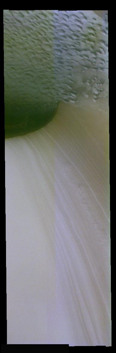 This image of shows a cross sectional view of the ice layers. Note the subtle peach banding on the left side of the image. The time variation that the bands represent is not yet understood.