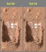 It shows lumps of ice in the lower left corner of a trench nicknamed "Dodo-Goldilocks." These lumps later sublimated, a process similar to evaporation, over the course of four days.