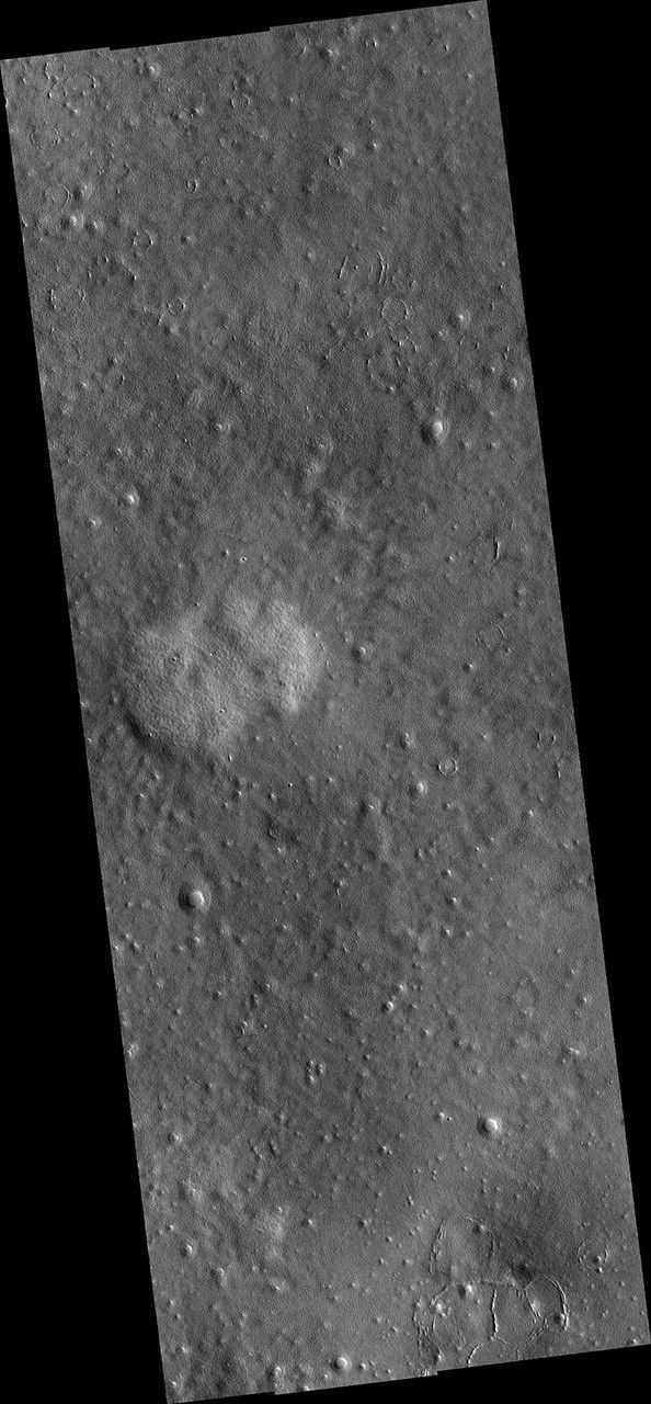 At high resolution the surface is divided by polygonal fractures, spaced a few meters apart. These polygons are common on the northern plains and were seen by the Phoenix Lander. They form when annual temperature cycles cause the ice to fracture as it expands and shrinks. The polygons are especially prominent and well-defined in a shallow pit in the (west-center part of the) image, which may indicate that depth or purity of the ice is different there.