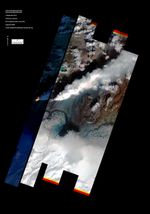 The image on the right shows the combined ALI and Hyperion data (a narrow strip at the western edge of the broad ALI swath). To the south is the edge of Dyngjujökull (an icecap) and to the north is the circular lake at another volcano called Askja. The ongoing eruption is from a fissure over 0.6 miles (1 kilometer) long, feeding lava flows and generating a plume of water vapor and ash.