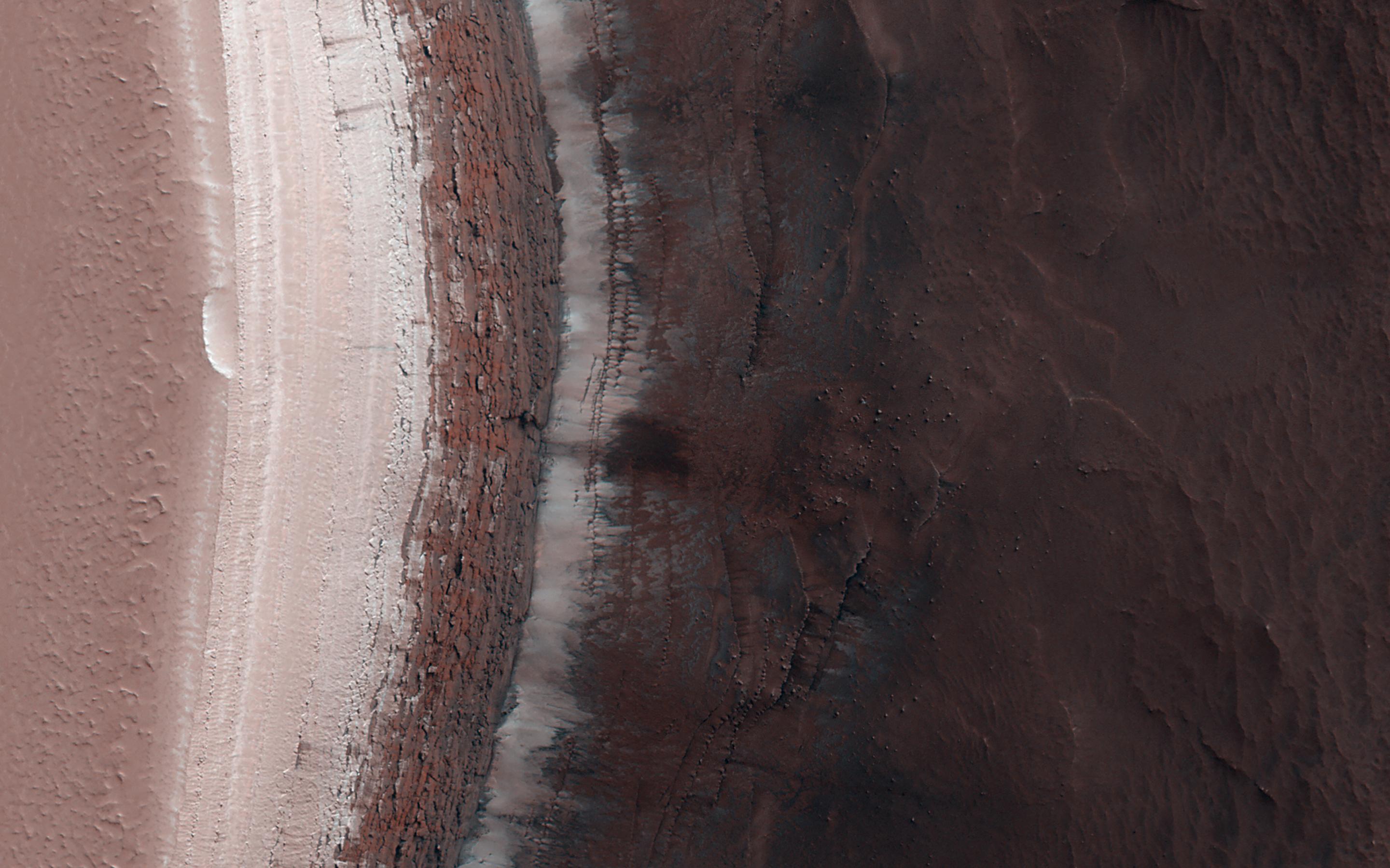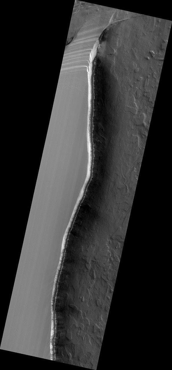 With HiRISE images like this one we can look at this cliff face and see it is broken up into jagged blocks. Debris piles at the base of the cliff show where these blocks have fallen out.