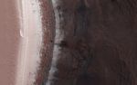 An ice cap about three kilometers (two miles) thick exists at the North Pole of Mars. In some locations its edge is a cliff about 800 meters (half a mile) high that is an almost-vertical wall of ice.