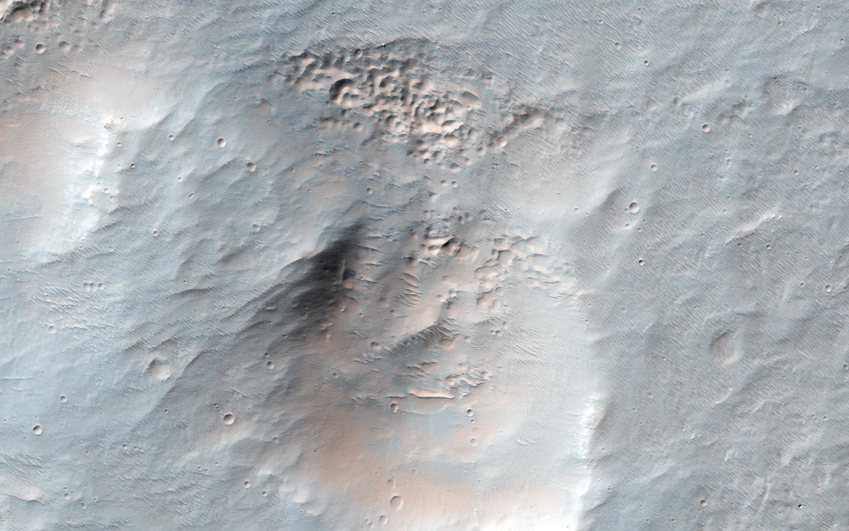 Presently, there are a few sand dunes and a broad overlay of a dusty soil mantle. This soil mantle occurs over much of the middle latitudes of Mars. Here, as elsewhere, the mantle covers these craters, but a closer inspection reveals that its smooth texture becomes significantly pitted and bumpy on the pole facing slopes of each crater interior wall.