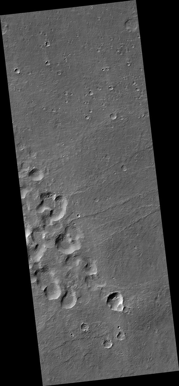 This image shows an interesting collection of kilometer-scale craters with flat and smooth floors. The craters themselves may be the result of secondary impacts, craters caused by debris from a distant larger impact. Since then, the surface has been significantly modified and reworked, muting the craters and flattening their floors.