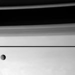 The image was taken with the Cassini spacecraft narrow-angle camera on Aug. 13, 2007 using a spectral filter sensitive to wavelengths of infrared light centered at 750 nanometers. The view was obtained at a distance of approximately 4.1 million kilometers (2.5 million miles) from Saturn. Image scale is 24 kilometers (15 miles) per pixel on Saturn and 21 kilometers (13 miles) per pixel on Rhea.