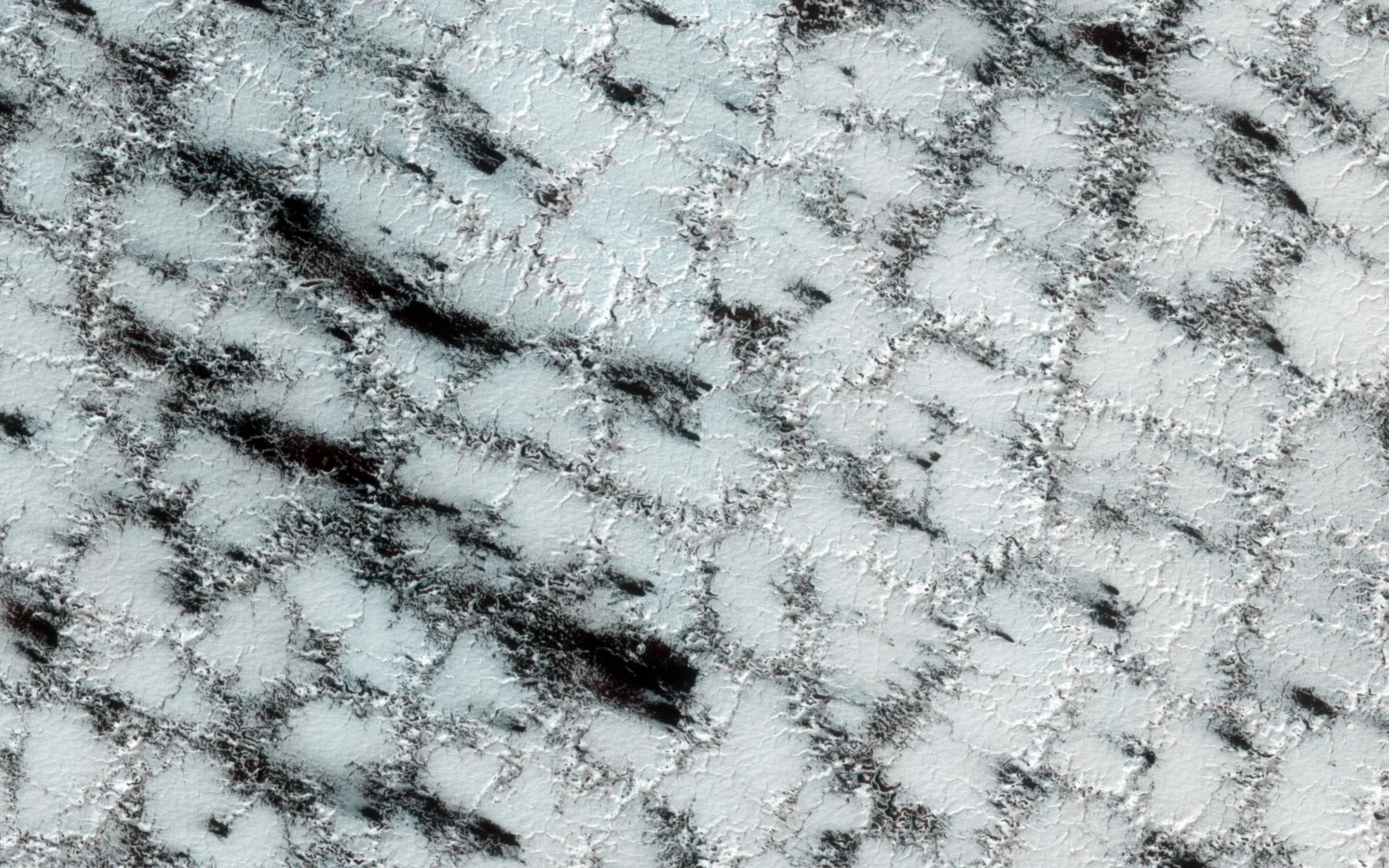 The weak boundaries of the polygonal structure of the surface have been eroded by spring sublimation of carbon dioxide as energy from the Sun turns ice to gas. The larger troughs in this image accentuate the surface polygonal structure, while the narrow cracks show the erosion caused when carbon dioxide gas escapes from under the seasonal ice layer carrying fine material from the surface.