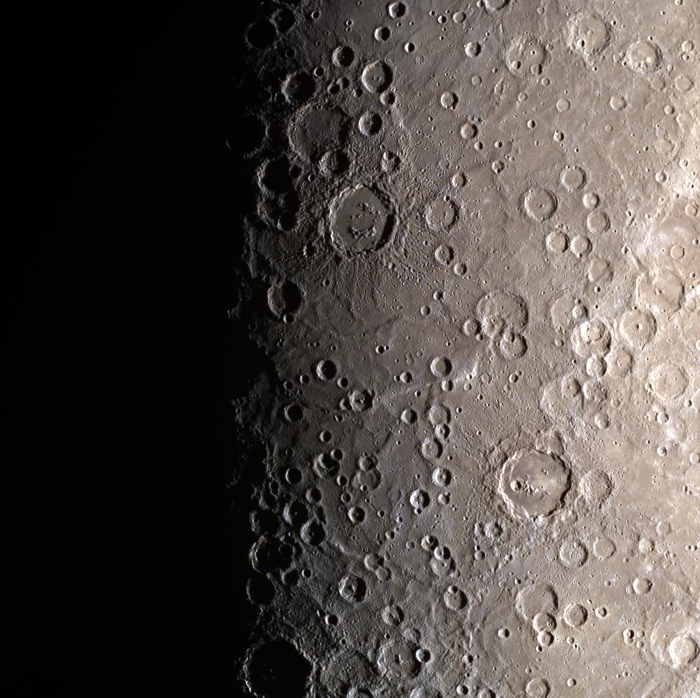 The terminator returns! This color image portrays the striking separation of night and day on Mercury, evident in the change from dark to light. On Mercury, a solar day (the time it takes for the Sun to return to the same spot in the sky) is equal to 176 Earth days! Check out this animation of a day on Mercury!