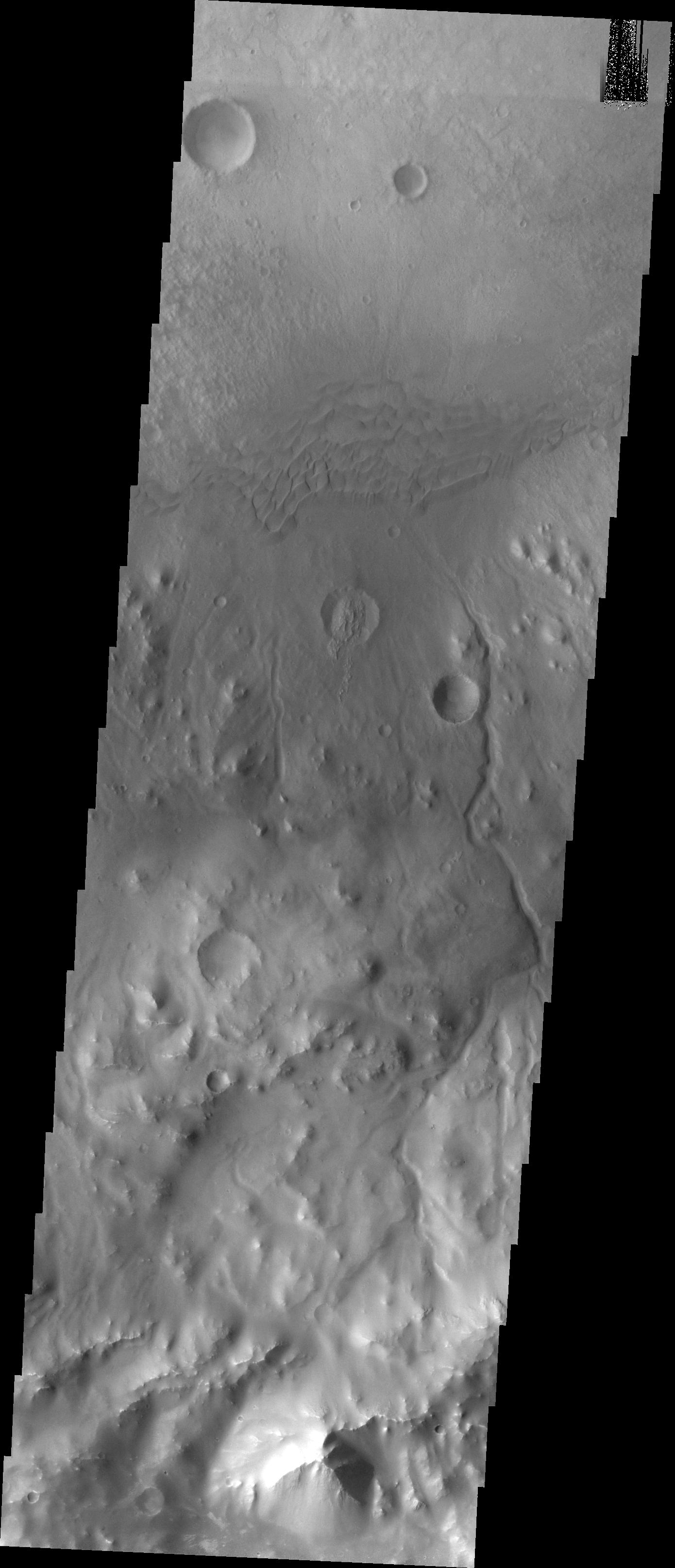 Following the dunes eastward, we find several channels dissecting the crater rim. These channels may be the source of material for the sand dunes.
