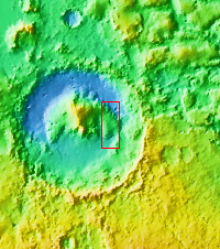 During the month of April Mars will be in conjunction relative to the Earth. This means the Sun is in the line-of-sight between Earth and Mars, and communication between the two planets is almost impossible. For conjunction, the rovers and orbiting spacecraft at Mars continue to operate, but do not send the data to Earth. This recorded data will be sent to Earth when Mars moves away from the sun and the line-of-sight between Earth and Mars is reestablished. During conjunction the THEMIS image of the day will be a visual tour of Gale Crater, the location of the newest rover Curiosity.