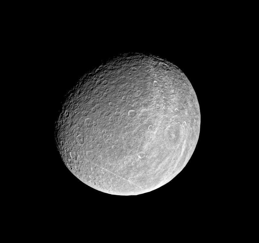 This image was taken in visible light with the Cassini spacecraft narrow angle camera on Jan. 16, 2005, at a distance of approximately 500,000 kilometers (311,000 miles) from Rhea and at a Sun-Rhea-spacecraft, or phase, angle of 35 degrees. (PIA06578 is a true color version of this image.) Resolution in the original image was about 3 kilometers (2 miles) per pixel. The image has been rotated so that north on Rhea is up. Contrast was enhanced and the image was magnified by a factor of two to aid visibility.