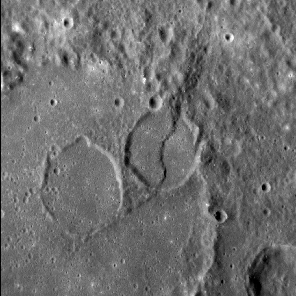 The 220-km-diameter Renoir basin has a well-preserved peak ring, within which are situated the two flooded craters near the center of this image. Both craters formed after Renoir but before the basin interior was resurfaced by smooth plains. Subsequent tectonic activity was then responsible for the sinuous lobate scarp that cross-cuts the center crater. Together, impact cratering, volcanism, and tectonism have helped shape the Renoir basin, substantially modifying its original form.