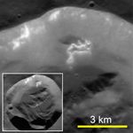 This high-resolution view shows a small, fresh 15-km-diameter impact crater (inset) at a high northern latitude on Mercury. Bright material is exposed on the upper part of the south-facing wall, and hollows are present on a section of the wall that has slumped partway down toward the floor.