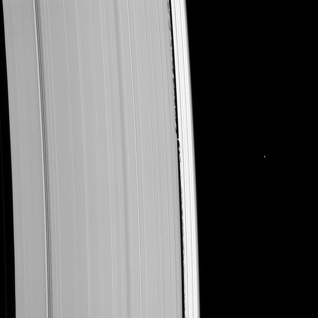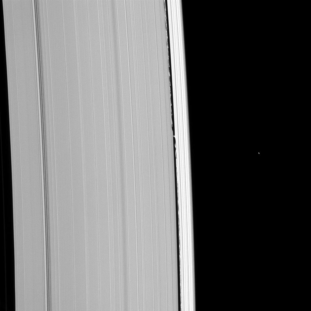 The gravity of the small moon (8 kilometers, or 5 miles across) is enough to carve wavelike perturbations into the material of the outer A ring. The bright object to the right of the rings is a star, not a moon.