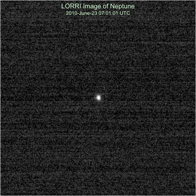 The New Horizons Long Range Reconnaissance Imager (LORRI) observed Neptune on June 23, apl2010, as part of a test of the critical optical navigation Annual Checkout (ACO)-4. In this 100-millisecond exposure, taken when the spacecraft was 23.2 astronomical units (about 2.15 billion miles) from Neptune, the planet appears slightly larger than a star. At the time of this observation, the solar phase angle (the spacecraft-planet-Sun angle) was 34 degrees and the solar elongation angle (planet-spacecraft -Sun angle) was 95 degrees. Only New Horizons can observe Neptune at such large solar phase angles, which can be used to study the light-scattering properties of Neptune's atmosphere.