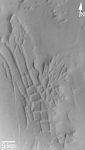 The Mars Global Surveyor (MGS) Mars Orbiter Camera (MOC) has provided new information about the "Inca City" ridges, though the camera's images still do not solve the mystery. The new information comes in the form of a MOC red wide angle context frame taken in mid-southern spring, shown above left and above right. The original Mariner 9 view of the ridges is seen at the center. The MOC image shows that the "Inca City" ridges, located at 82°S, 67°W, are part of a larger circular structure that is about 86 km (53 mi) across. It is possible that this pattern reflects an origin related to an ancient, eroded meteor impact crater that was filled-in, buried, then partially exhumed. In this case, the ridges might be the remains of filled-in fractures in the bedrock into which the crater formed, or filled-in cracks within the material that filled the crater. Or both explanations could be wrong. While the new MOC image shows that "Inca City" has a larger context as part of a circular form, it does not reveal the exact origin of these striking and unusual martian landforms.