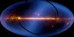 Nearly the entire sky, as seen in infrared wavelengths and projected at one-half degree resolution, is shown in this image, assembled from six months of data from the Infrared Astronomical Satellite, or IRAS. The bright horizontal band is the plane of our Milky Way galaxy, with the center of the galaxy located at the center of the picture. (Because of its proximity, the Milky Way dominates our view of the entire sky, as seen in this image. IRAS data processed to show smaller regions of the sky, however, reveal thousands of sources beyond the Milky Way.) The colors represent infrared emission detected in three of the telescope's four wavelength bands (blue is 12 microns; green is 60 microns, and red is 100 microns). Hotter material appears blue or white while the cooler material appears red. The hazy, horizontal S-shaped feature that crosses the image is faint heat emitted by dust in the plane of the solar system. Celestial objects visible in the photo are regions of star formation in the constellation Ophiucus (directly above the galactic center) and Orion (the two brightest spots below the plane, far right). The Large Magellanic Cloud is the relatively isolated spot located below the plane, right of center. Black stripes are regions of the sky that were not scanned by the telescope in its first six months of operation.