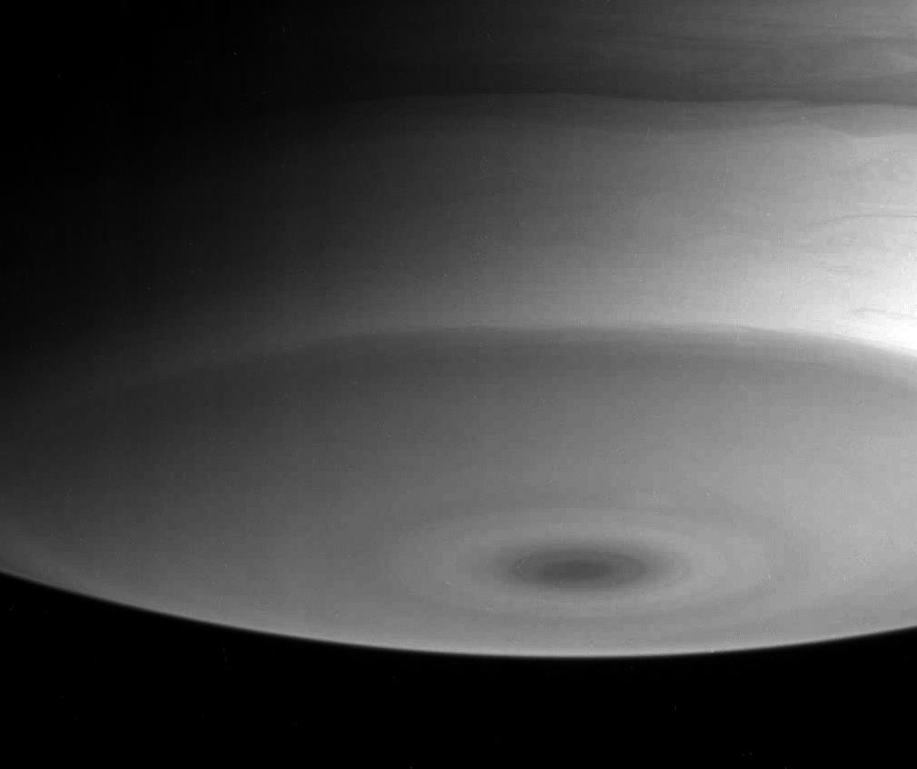 This view of Saturn's south pole shows a prominent dark spot, along with flowing, wave-like patterns to the north and toward the right.
