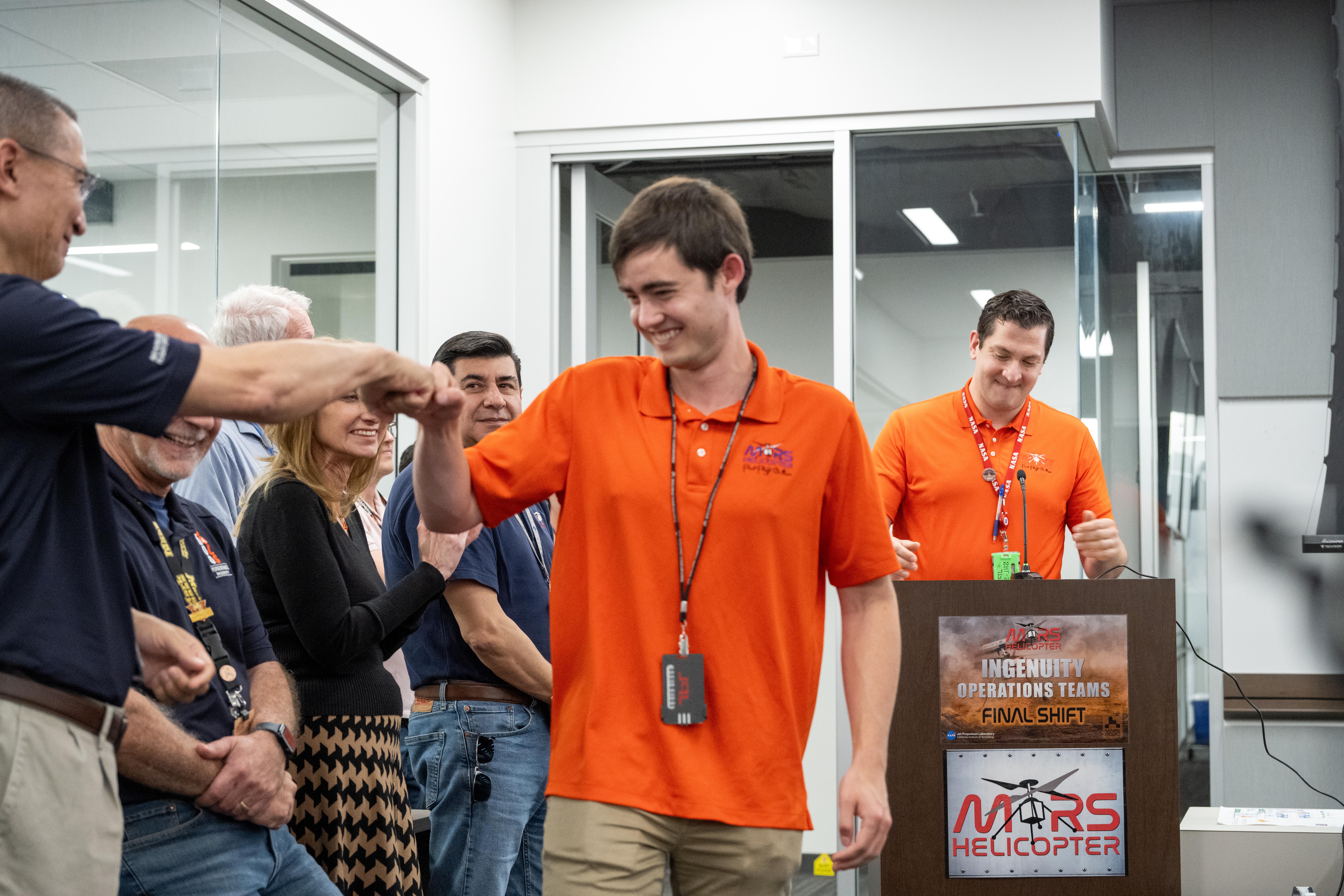Ingenuity team lead Josh Anderson celebrates with Perseverance rover deputy project manager Steve Lee during the final shift for engineers working on NASA's Ingenuity Mars Helicopter at the agency's Jet Propulsion Laboratory on April 16, 2024. The team for the first aircraft on another world gathered to review a transmission that confirmed a software patch allowing Ingenuity to act as a stationary testbed and collect data that could benefit future explorers of the Red Planet.