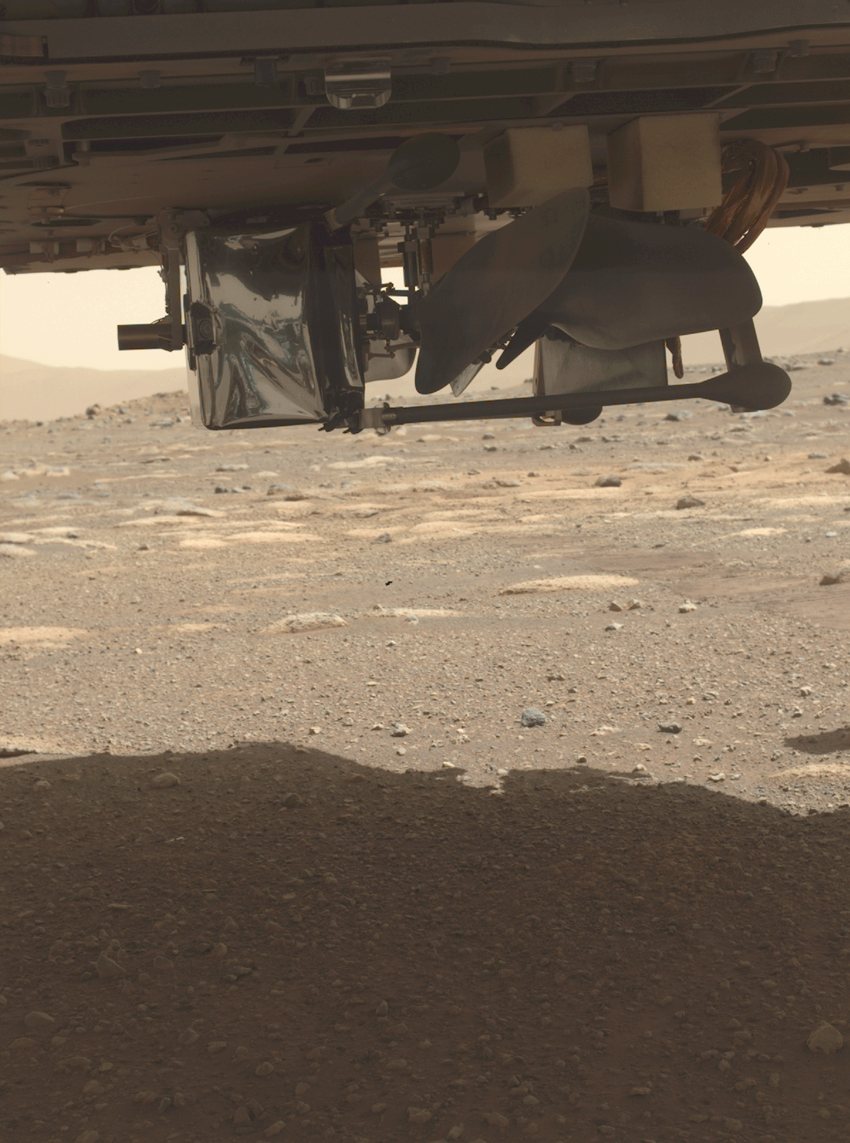 NASA's Ingenuity Mars Helicopter can be seen on the belly of the Perseverance rover on March 26, 2021, the 36th Martian day, or sol, of the mission. The helicopter's launch lock, which holds it in place on the rover, has been released. This image was taken by the WATSON (Wide Angle Topographic Sensor for Operations and eNgineering) camera on the SHERLOC (Scanning Habitable Environments with Raman and Luminescence for Organics and Chemicals) instrument, located at the end of the rover's long robotic arm.