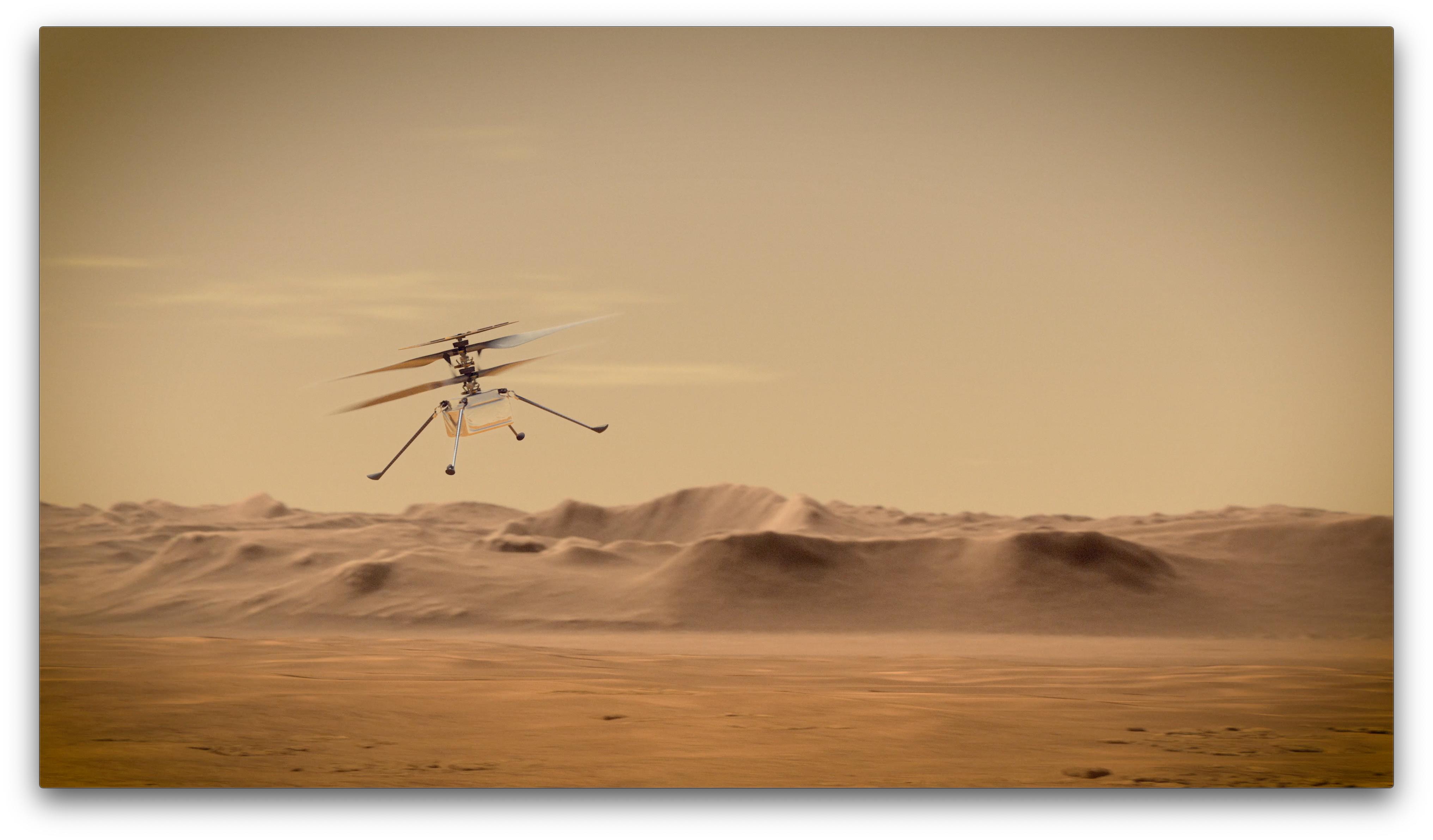 Ingenuity, a technology experiment, will be the first aircraft to attempt controlled flight on another planet. It will arrive on Mars on Feb. 18, 2021, attached to the belly of NASA's Mars 2020 Perseverance rover. Ingenuity is expected to attempt its first flight test in spring 2021.