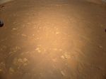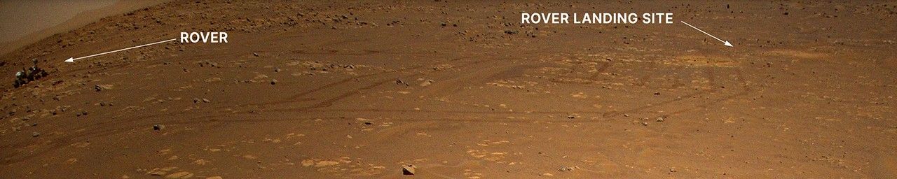 NASA's Perseverance Mars rover is visible in the upper left corner of this image the agency's Ingenuity Mars Helicopter took during its third flight, on April 25, 2021. The helicopter was flying at an altitude of 16 feet (5 meters) and roughly 279 feet (85 meters) from the rover at the time.