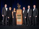 Members of NASA's Ingenuity Mars Helicopter team stand next to the Collier Trophy during the Robert J. Collier Dinner in Washington on June 9, 2022. The team was awarded the 2021 Collier Trophy "for the first powered, controlled flight of an aircraft on another planet, thereby opening the skies of Mars and other worlds for future scientific discovery and exploration," the award citation states.