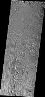This unusual surface texture is found on the northwest part of Olympus Mons. The origin of this texture and the rest of Lycus Sulci is unknown, but speculations include glacial or volatile rich materials as part of the cause of such textures.