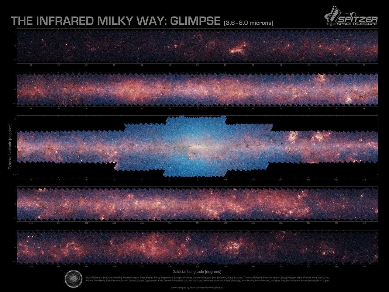 In this mosaic the galactic plane is broken up into five components: the far-left side of the plane (top image); the area just left of the galactic center (second to top); galactic center (middle); the area to the right of galactic center (second to bottom); and the far-right side of the plane (bottom). Together, these panels represent more than 50 percent of our entire Milky Way galaxy.