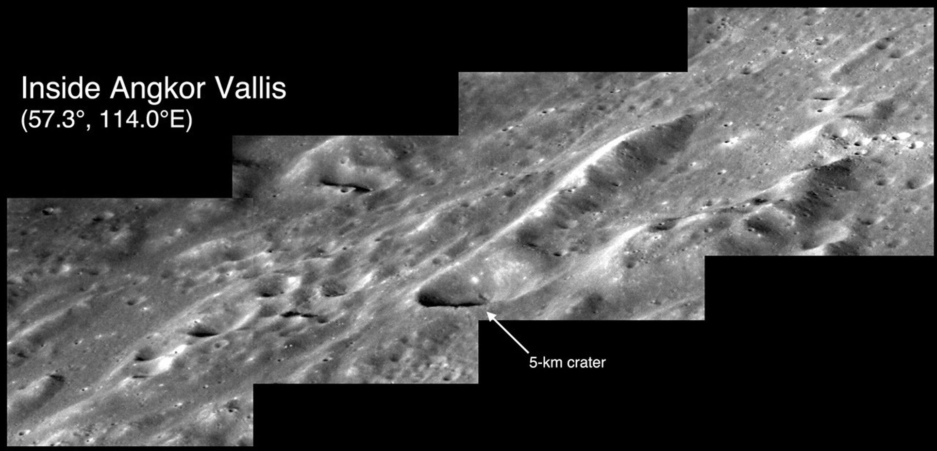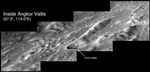 The striking topography inside of Angkor Vallis is believed to have formed by hot, quick-flowing lavas moving across Mercury's surface. Shown here is a mosaic of four NAC images acquired from a grazing, highly oblique, viewing geometry of the surface. This provides a view that accentuates the height of the landforms within the volcanic valley.