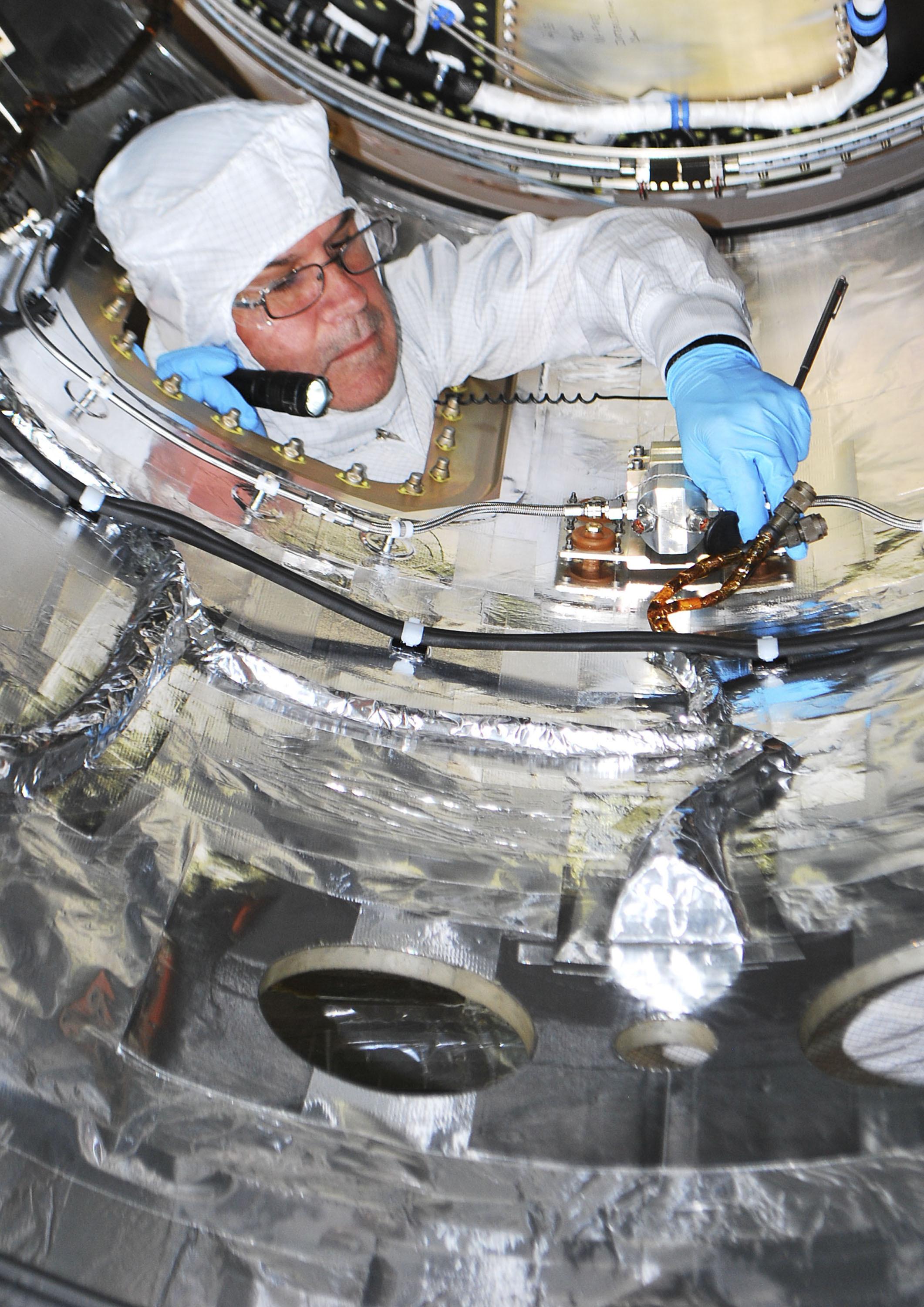 A spacecraft technician is performing closeout work inside the fairing that will be installed around NASA's Nuclear Spectroscopic Telescope Array (NuSTAR) spacecraft in a processing facility at Vandenberg Air Force Base in California. The fairing will protect the spacecraft from the heat and aerodynamic pressure generated during ascent to orbit aboard an Orbital Sciences Pegasus XL rocket. After processing of the rocket and spacecraft are complete, they will be flown on Orbital's L-1011 carrier aircraft from Vandenberg to the Ronald Reagan Ballistic Missile Defense Test Site on the Pacific Ocean¹s Kwajalein Atoll for launch. The high-energy X-ray telescope will conduct a census of black holes, map radioactive material in young supernovae remnants, and study the origins of cosmic rays and the extreme physics around collapsed stars.