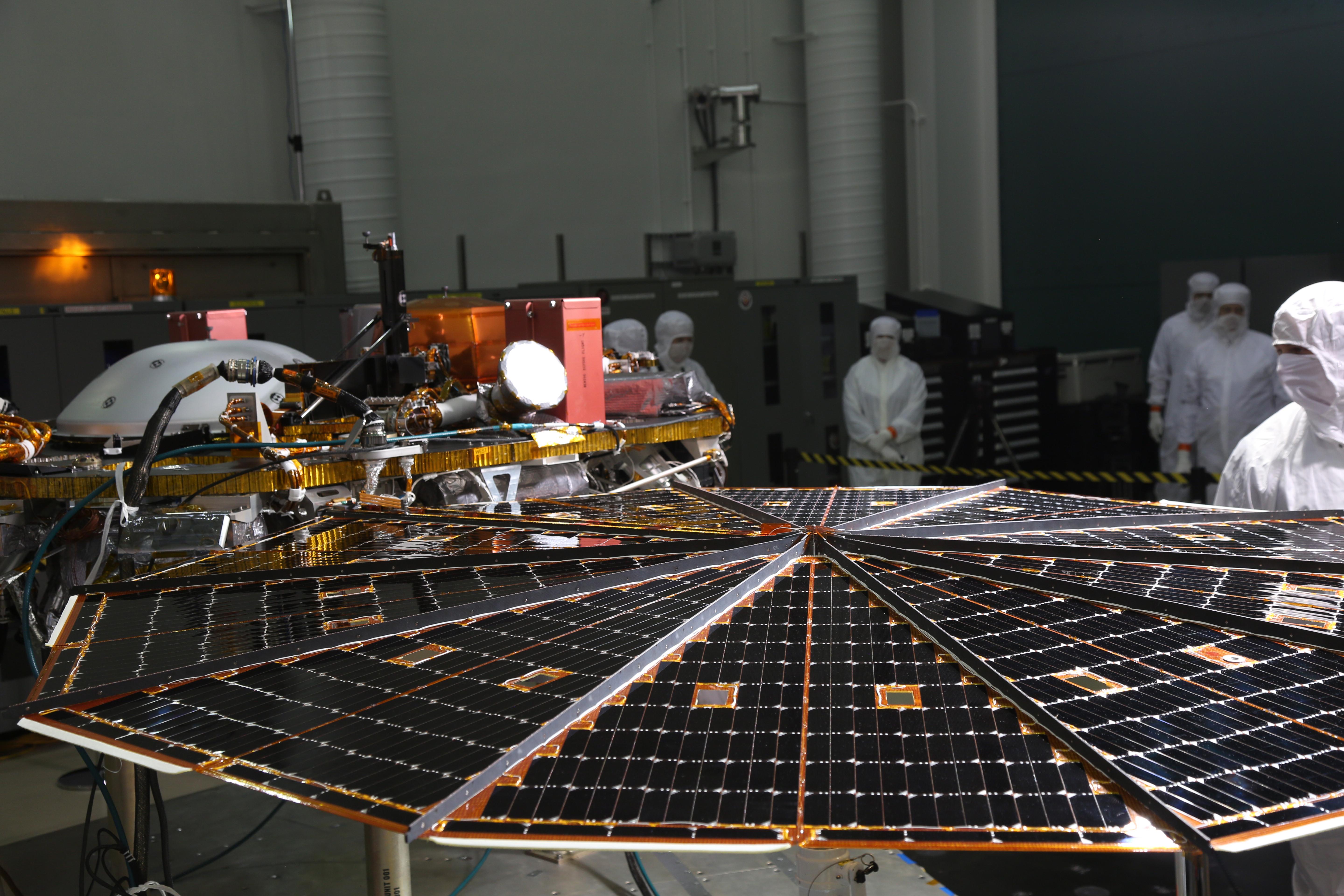While in the landed configuration for the last time before arriving on Mars, NASA's InSight lander was commanded to deploy its solar arrays to test and verify the exact process that it will use on the surface of the Red Planet. During the test on Jan. 23, 2018 from the Lockheed Martin clean room in Littleton, Colorado, engineers and technicians evaluated that the solar arrays fully deployed and conducted an illumination test to confirm that the solar cells were collecting power.