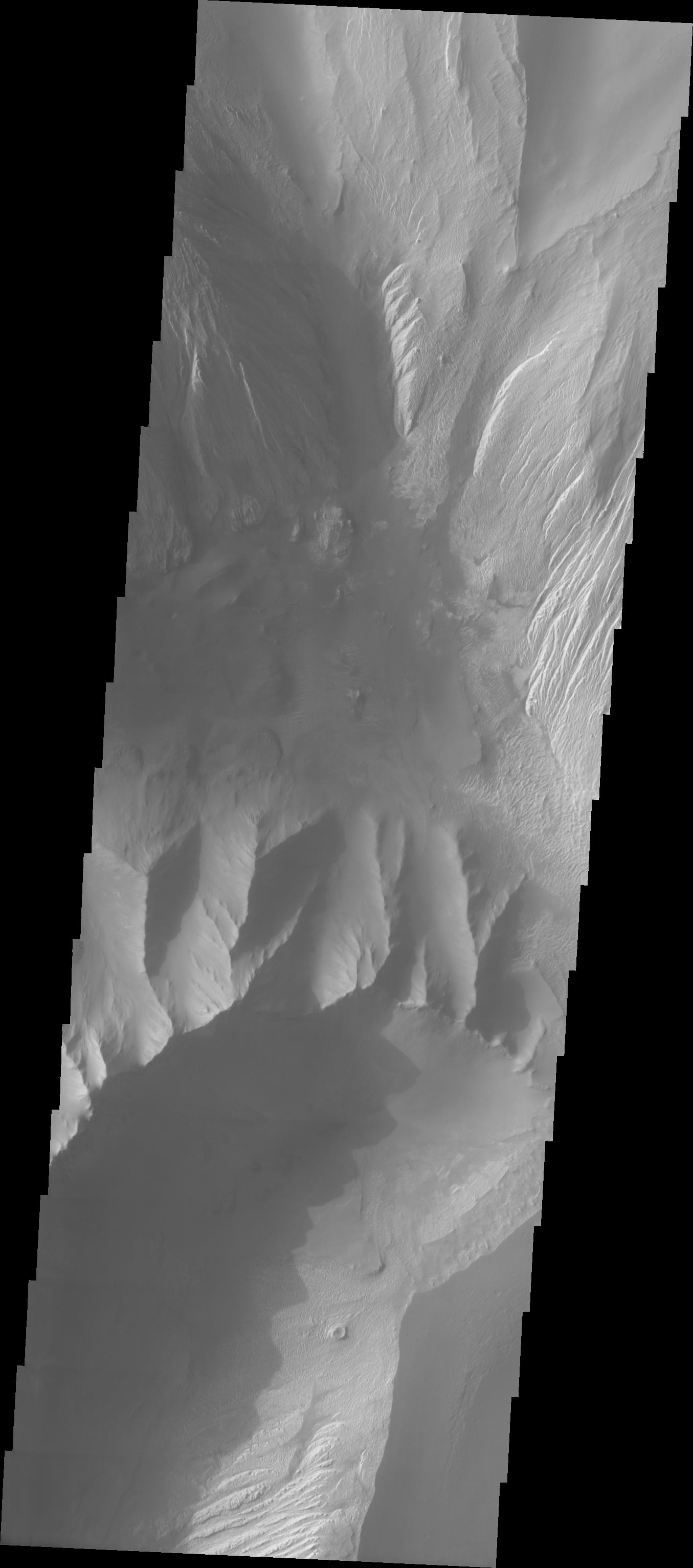Note: this THEMIS visual image has not been radiometrically nor geometrically calibrated for this preliminary release. An empirical correction has been performed to remove instrumental effects. A linear shift has been applied in the cross-track and down-track direction to approximate spacecraft and planetary motion. Fully calibrated and geometrically projected images will be released through the Planetary Data System in accordance with Project policies at a later time.