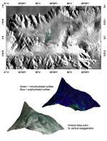 The lower two images are renderings of data draped over topography without vertical exaggeration. These images provide a view of the knob's elevation relative to the surrounding terrain. The lower left image is in infrared false color, and shows light-colored material exposed on the flanks of the layered deposits. The upper right image shows measures of the strengths of different mineral signatures in the red, green, and blue image planes, and reveals diversity in the mineral content of this light-colored material. Some areas have no signature in the data, indicating dust-like spectral properties, while other areas have signatures of monohydrated or polyhydrated sulfate. This signifies a variety of compositions within these layered deposits.
