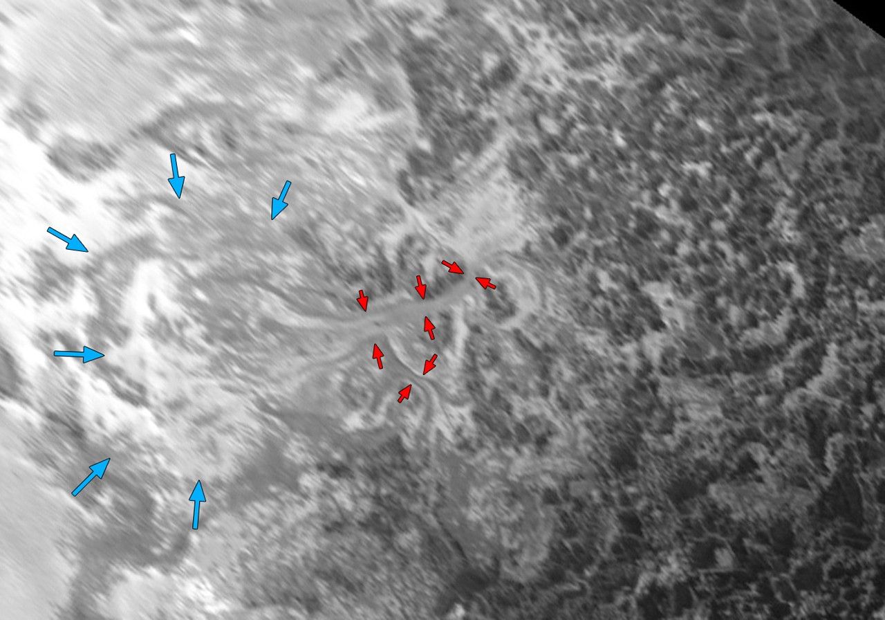 This image is re-projected from the oblique, backlit view shown in the new crescent image of Pluto. The backlighting highlights the intricate flow lines on the glaciers. The flow front of the ice moving into the informally named Sputnik Planum is outlined by the blue arrows (Figure 1). The origin of the ridges and pits on the right side of the image remains uncertain. This image is 390 miles (630 kilometers) across.