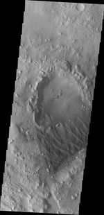 The small crater in the middle of the image is at the upwind side of the dune field. There is a considerable amount of sand within the crater, with a relatively smooth surface and few dune forms. It is likely that this crater provides a source of available sand for the large dune field.