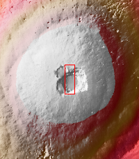 This image shows part of the complex caldera at the summit of the volcano. Calderas are found at the tops of volcanoes and are the source region for magma that rises from an underground lava source to erupt at the surface. Volcanoes are formed by repeated flows from the central caldera. The final eruptions can pool within the summit caldera, leaving a flat surface as they cool. Calderas are also a location of collapse, creating rings of tectonic faults that form the caldera rim. Ascraeus Mons has several caldera features at its summit.
