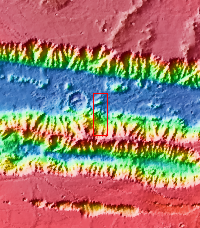 Coprates Chasma is one of the numerous canyons that make up Valles Marineris. The chasma stretches for 960 km (600 miles) from Melas Chasma to the west and Capri Chasma to the east. Landslide deposits, layered materials and sand dunes cover a large portion of the chasma floor. This image is located in central Coprates Chasma. The brighter materials at the bottom of the image are layered deposits. It is unknown how deep these canyon deposits were when they formed. The layering is only visible due to erosion, making it difficult to estimate the original thickness. While layered deposits can be found on the floor of Coprates Chasma, they are most commonly found along the lower elevations and at the bottom of the cliff faces in the canyon.