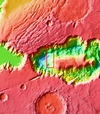 This image shows part of the western side of Hebes Chasma. The large central mesa is on the right side of the image. The smooth region in the lower left side of the image is a region of sand and sand dunes. These features indicate that winds played a part in eroding materials inside the chasma. Hebes Chasma is an enclosed basin not connected to Valles Marineris.