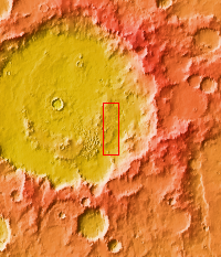 Kaiser Crater is located in the southern hemisphere in the Noachis region west of Hellas Planitia. Kaiser Crater is just one of several large craters with extensive dune fields on the crater floor. Other nearby dune filled craters are Proctor, Russell, and Rabe. Kaiser Crater is 207 km (129 miles) in diameter. The dunes are located in the southeastern part of the crater floor. Most of the individual dunes in Kaiser Crater are barchan dunes. Barchan dunes are crescent shaped with the points of the crescent pointing downwind. The sand is blown up the low angle side of the dune and then tumbles down the steep slip face. This dune type forms on hard surfaces where there is limited amounts of sand. Barchan dunes can merge together over time with increased sand in the local area.