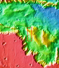 Melas Chasma is part of the largest canyon system on Mars, Valles Marineris. At only 563 km long (349 miles) it is not the longest canyon, but it is the widest. Located in the center of Valles Marineris, it has depths up to 9 km below the surrounding plains, and is the location of many large landslide deposits, as will as layered materials and sand dunes. There is evidence of both water and wind action as modes of formation for many of the interior deposits. Today's image is just a bit further to the west of yesterday's. Here there are no dunes, but extensive outcrops of layered material. It is possible that these layered deposits were formed by sediments settling in a lake.