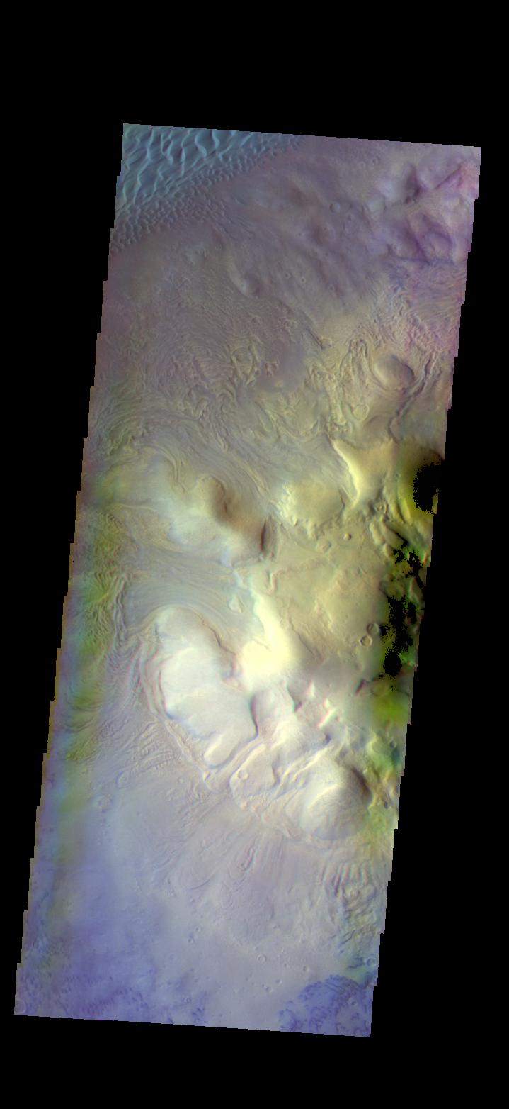 The THEMIS VIS camera contains 5 filters. The data from different filters can be combined in multiple ways to create a false color image. These false color images may reveal subtle variations of the surface not easily identified in a single band image.