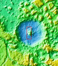 This image of Moreux Crater shows the highest elevations of the central peak, as well as the nearby sand dunes. In this false color image sand dunes are "blue". Smaller patches of blue are located on the central peak materials and indicate where surface winds have moved fine materials on/off the peak deposits. The pitted and curvilinear morphology of the central peak deposits have been interpreted to have formed by glacial activity. Moreux Crater is located in northern Arabia Terra and has a diameter of 138 kilometers.