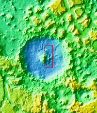 This image of Moreux Crater shows the eastern side of the central peak, as well as the nearby sand dunes. In this false color image sand dunes are "blue". Smaller patches of blue are located on the central peak materials and indicate where surface winds have moved fine materials on/off the peak deposits. The pitted and curvilinear morphology of the central peak deposits have been interpreted to have formed by glacial activity. Moreux Crater is located in northern Arabia Terra and has a diameter of 138 kilometers.