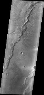 This image shows part of the dune field near Meroe Patera. High resolution imaging by other spacecraft has revealed that the dunes in this region are moving. Winds are blowing the dunes across a rough surface of regional volcanic lava flows. The paterae are calderas on the volcanic complex called Syrtis Major Planum. Dunes are found in both Nili and Meroe Paterae and in the region between the two calderas.