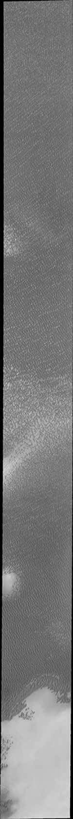 This VIS image of Olympia Undae was collected during north polar summer. The dunes are now completely frost free and are dark in color due to being made of basaltic sand. The surface between the dunes, where visible, is a bright tone. In some regions of dense dunes, the bright material may be a deposit on the dunes rather than the underlying surface. The presence of gypsum has been suggested for Olympia Undae, gypsum is a lighter tone than basalt in this filter of the THEMIS VIS camera.