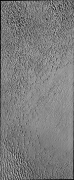 Olympia Undae is a vast dune field in the north polar region of Mars. It consists of a broad sand sea or erg that partly rings the north polar cap from about 120° to 240°E longitude and 78° to 83°N latitude. The dune field covers an area of approximately 470,000 km2 (bigger than California, smaller than Texas). Olympia Undae is the largest continuous dune field on Mars. Olympia Undae is not the only dune field near the north polar cap, several other smaller fields exist in the same latitude, but in other ranges of longitude, e.g. Abolos and Siton Undae. Barchan and transverse dune forms are the most common. In regions with limited available sand individual barchan dunes will form, the surface beneath and between the dunes is visible. In regions with large sand supplies, the sand sheet covers the underlying surface, and dune forms are found modifying the surface of the sand sheet. In this case transverse dunes are more common. Barchan dunes "point" down wind, transverse dunes are more linear and form parallel to the wind direction. The "square" shaped transverse dunes in Olympia Undae are due to two prevailing wind directions.